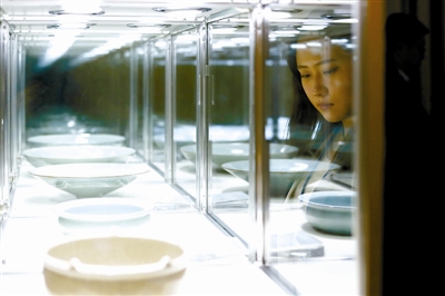 9月10日,在位于纽约的联合国总部,一名女子在2018龙泉青瓷巡展上观看展品。