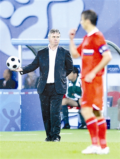 图为2008年6月26日,俄罗斯队主教练希丁克在2008欧洲足球锦标赛半决赛对阵西班牙队的比赛中。新华社记者 吴晓凌 摄
