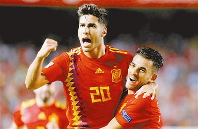 9月11日,西班牙队球员阿森西奥(左)在比赛中庆祝进球。