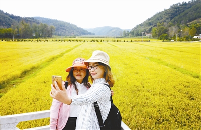 两名外地游客在陕西省延安市南泥湾镇南泥湾村的稻田旁留影(9月12日摄)。