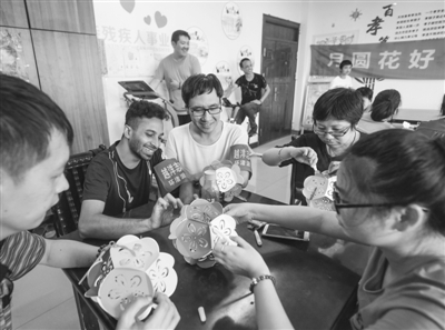 9月12日,外籍志愿者在社区的“残疾人小康阳光庇护中心”陪伴社区残障人士一起学做小彩灯。
