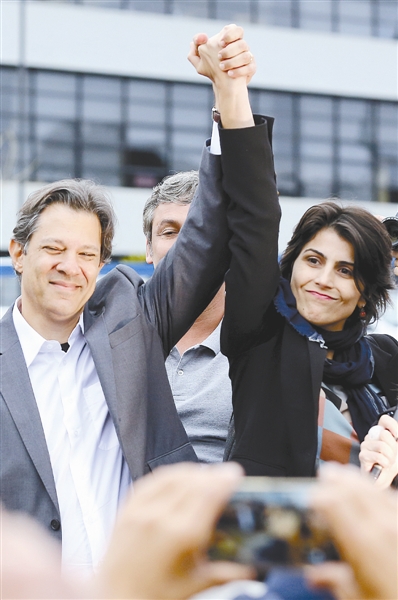9月11日,在巴西南部城市库里蒂巴,巴西劳工党新总统候选人费尔南多·阿达(左)与其副手蔓努埃拉·达维拉出席劳工党新总统候选人宣布仪式。