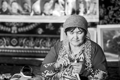 依巴代提在新疆昌吉回族自治州奇台县五马场哈萨克族乡鸿鑫村“爱心超市”里纳鞋底,卖鞋收入全部为善款(9月13日摄)。2015年3月,国网昌吉供电公司帮助依巴代提建成了这个“爱心超市”。超市接受村民捐赠物品,再转送给需要的人。新华社记者 赵戈 摄