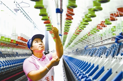 宁夏吴忠市红寺堡区红寺堡镇红海村村民周玉英在镇里的恒丰纺织厂生产车间工作(9月8日摄)。