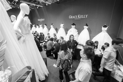 历年的国庆节都可谓是“结婚黄金周”,今年也不例外。随着国庆小长假的临近,婚庆市场也开始升温,不少商家都开始推出特色套餐,迎接“十一”结婚潮。图为近日在北京举行的婚庆博览会上,消费者正与销售人员进行交流。
