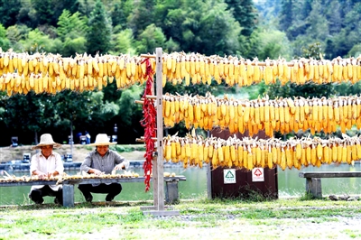 9月19日,西递村村民在一处空地上晾晒玉米。