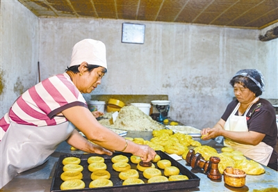 9月17日,河北张家口万全区一家传统手工月饼厂内,工人通过模型对制作好的月饼进行挤压成形。中秋节即将到来,工人们加紧生产,以保证及时供应市场。 张强 摄/视觉中国