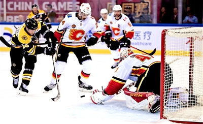 9月19日,NHL2018中国赛北京站在五棵松体育馆进行,卡尔加里火焰与波士顿棕熊联手奉献了一场精彩的比赛,最终波士顿棕熊以3比1战胜卡尔加里火焰。图为波士顿棕熊队员进攻。