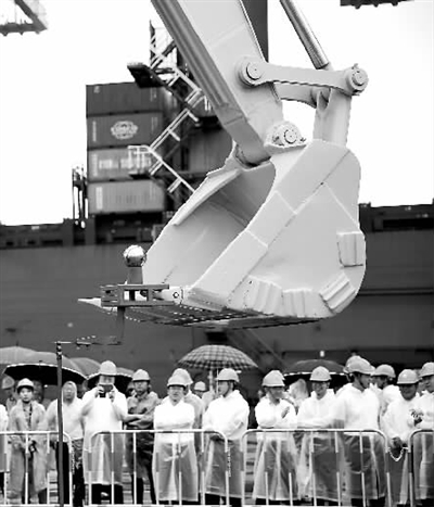 9月19日,在青岛前湾港安全大比武现场,挖掘机司机在进行 “轻功掘技”项目竞赛。当日,以“展现港口技能工匠风采,建设世界一流海洋港口”为主题的青岛港2018年技术安全大比武雨中开赛,来自34个基层单位的 1138名选手,展开激烈角逐。