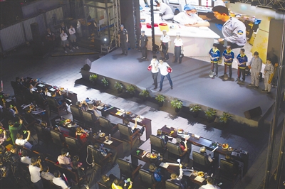 9月21日晚,在北京地铁19号线位于牡丹园站的建设工地上,一场农民工走秀节目正在上演。保安、厨师、隧道工、安全员等不同岗位的职工着一袭工装,昂首阔步亮相舞台,引得掌声阵阵。