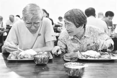 两名老人在广州市民乐街长者饭堂就餐。自2016年3月以来,广州市全面铺开建设长者饭堂,目前全市有长者饭堂952个,街道(镇)、社区(村)覆盖率达到100%。 视觉中国 供图