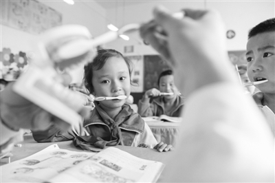 9月19日,在山东省高青县青城镇中心小学,学生练习正确的刷牙方法。
