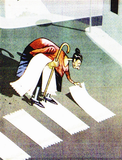车流滚滚的大街上,行人显然已成弱势之群,老妇人携“斑马线”上路以保平安。联想我们的城市交通现状,读者肯定备感忧伤。