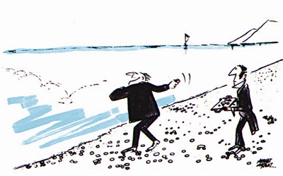 在岸边“打水漂”时,随手捡起石块投向大海是多么惬意!这位老兄为摆“谱”虽然省了一些力气,但也少了份愉悦。