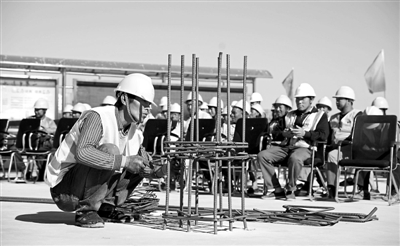 9月24日,在北京市大牛坊社区,中建三局工人进行梁柱钢筋绑扎比赛。