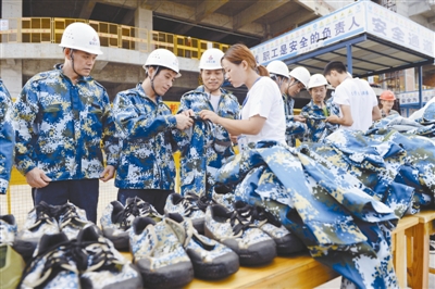 9月19日,在合肥经开区莲花社区一建筑工地,安徽医学高等专科学校学生正在为农民工试衣服。