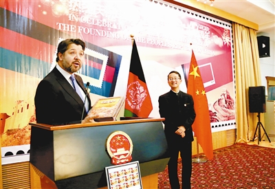 中国驻阿富汗大使馆当天举行国庆招待会。阿富汗代外长希克马特·哈利勒·卡尔扎伊在招待会上表示,阿富汗一贯珍视与中国的传统友谊,始终视中国为值得信赖的好邻居、好朋友、好伙伴,感谢中国长期以来给予阿方的支持与帮助。招待会上还举办了中阿联合邮票展。
