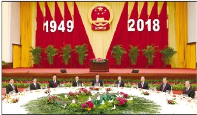 上图:9月30日晚,国务院在北京人民大会堂举行国庆招待会,热烈庆祝中华人民共和国成立六十九周年。习近平、李克强、栗战书、汪洋、王沪宁、赵乐际、韩正、王岐山等党和国家领导人与中外人士欢聚一堂,共庆佳节。