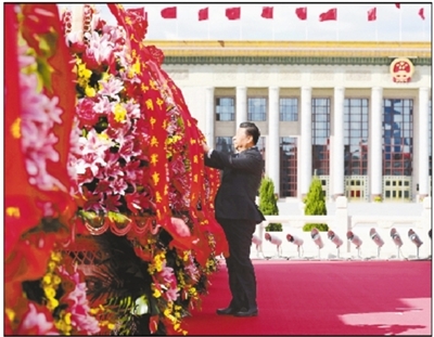 左图:9月30日上午,党和国家领导人习近平、李克强、栗战书、汪洋、王沪宁、赵乐际、韩正、王岐山等来到北京天安门广场,出席烈士纪念日向人民英雄敬献花篮仪式。这是习近平整理花篮上的缎带。 新华社记者 谢环驰 摄
