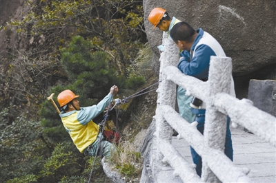 李培生是安徽黄山风景区玉屏环卫所的一名放绳工,他常年肩挎登山绳攀爬在悬崖峭壁间清理垃圾或帮助游客捡拾失物,在责任区巡查清捡。这样的放绳工,整个黄山风景区有18人。 新华社记者 张端 摄