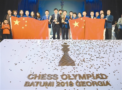 10月5日,2018国际象棋奥林匹克团体赛在格鲁吉亚巴统落幕。中国男队、女队双双逼平对手,在榜首群战里凭借小分优势携手夺冠。新华社发(塔穆娜摄)