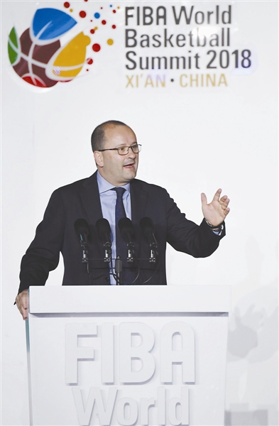 10月3日,2018世界篮球峰会在陕西西安拉开帷幕,国际篮联秘书长帕特里克·鲍曼在2018世界篮球峰会上发表演讲。 新华社记者 李一博 摄