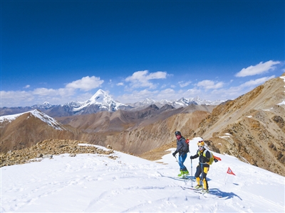 10月4日,滑雪爱好者、“体育旅游”探索者刘百灵(左)在位于西藏自治区当雄县羊八井镇的洛堆峰雪坡上练习。 新华社发