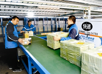 10月10日,几名快递员在北京东城区建国门街道“快递之家”通过快递传送带分拣包裹。