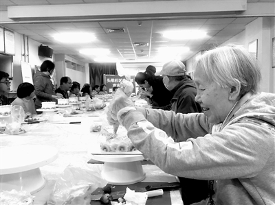 10月16日,在重阳节来临前,北京市海淀区北下关街道头堆社区,居委会请来蛋糕师教社区老人制作水果蛋糕。