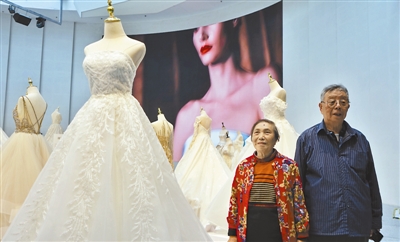 一对老夫妻驻足观看2018青岛国际婚纱高定品牌静态发布秀(图/董志刚)