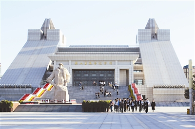 9月20日下午,参观完铁人王进喜纪念馆的游客经过铁人雕像。纪念馆目前已接待国内外游客900万人次。