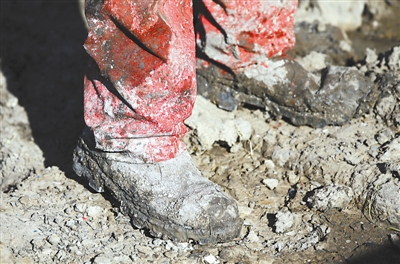 在工作现场,几乎每个人的鞋上都沾满了厚厚的泥浆。