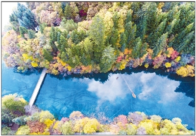 10月18日,九寨沟景区五花海修复后的景象(无人机拍摄)。目前,九寨沟景区正加紧恢复重建。据了解,2017年8月8日九寨沟地震造成个别景点不同程度受损。根据灾后重建总体规划,科学审慎地推进诺日朗瀑布、火花海等重点景点保护性修复。新华社记者 江宏景 摄