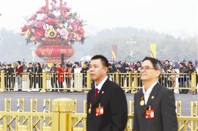 10月21日,中国工会十七大预备会议结束后,代表们步出北京人民大会堂。代表们胸前金灿灿的奖章、红闪闪的证件、亮晶晶的会徽吸引了天安门广场上的游客。