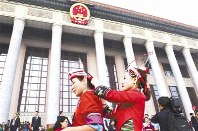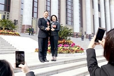 会议结束后,两位代表在人民大会堂前合影并互相点赞。