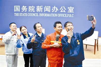 10月15日,国务院新闻办公室举行中外记者见面会,请5位产业工人优秀代表围绕“做大国工匠,争当知识型、技能型、创新型劳动者”主题与中外记者见面交流。见面会结束后,5位产业工人优秀代表拿起手机自拍留影。