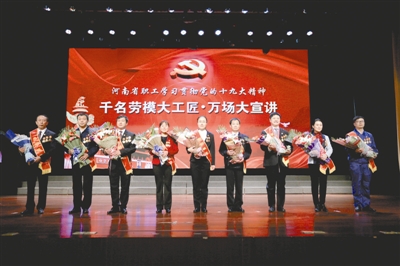 2017年11月10日,河南省职工学习贯彻党的十九大精神千名劳模大工匠·万场大宣讲首场宣讲会在省会郑州举行。来自生产一线职工中的党的十九大代表和劳模大工匠,当天为广大职工群众所做的十九大精神宣讲,在全省职工中引起强烈反响。