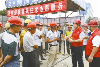 河南省总组织的劳模志愿服务活动中,“大工匠”李江福、李文政在给建筑工人讲解技术要领