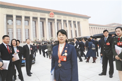 2018年10月22日,出席中国工会十七大的福建东飞环境集团有限公司内河保洁员罗祥英在人民大会堂前留影