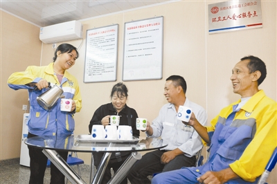 环卫工人们在福州市鼓楼区的环卫工人爱心服务点内工间休息