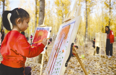 10月25日,河北沧州职教中心幼儿园的孩子来到大运河森林生态园内赏秋写生,用手中的画笔留住自然美景。 新华社 傅新春 摄