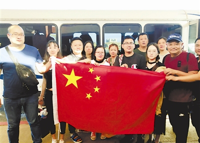 10月28日,在美属北马里亚纳群岛首府塞班岛,几名中国游客在启程前与国旗合影。新华社发