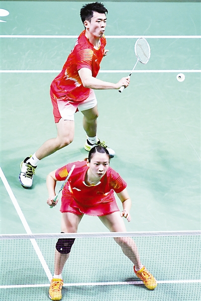 10月28日,中国组合郑思维(上)/黄雅琼在比赛中。当日,在法国公开赛混合双打决赛中,中国组合郑思维/黄雅琼以2比0战胜韩国组合徐承宰/蔡侑玎,夺得冠军。