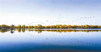 在位于新疆巴音郭楞蒙古自治州轮台县的一处胡杨林里,一群鸟从水面上飞过(10月25日摄)。