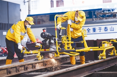 10月25日,参赛选手在用垂直打磨机进行辙叉打磨。