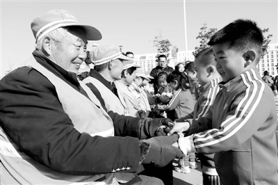 10月30日,江苏省东海县幼儿园的小朋友向环卫工人赠送手套。