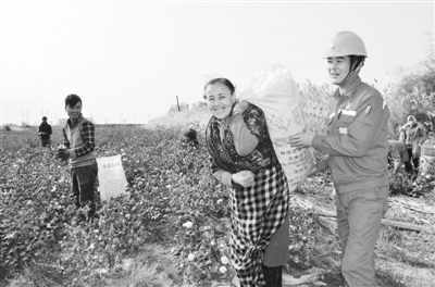 图为10月15日,采油三厂油气处理部员工黄刚(右)检修完设备,路过一段铺设有油气管线的棉田,他一边帮棉农采摘棉花,一边讲解安全注意事项。