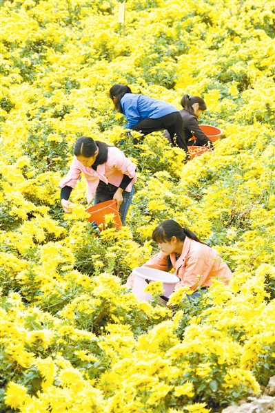 眼下,谢溪村种植的金丝皇菊竞相绽放,当地菊农忙着采摘、加工。新华社发(邓龙华 摄)