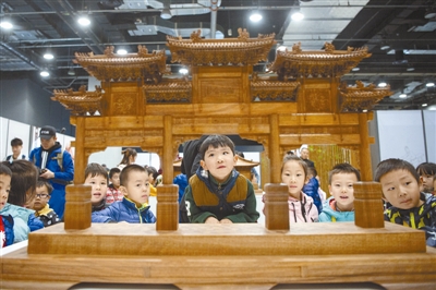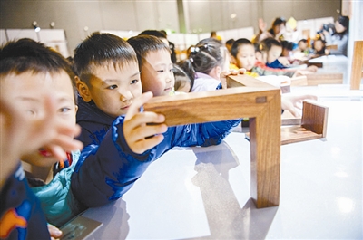 ①小观众们在观看榫卯结构模型——雍和宫牌坊。
