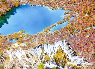 俯瞰九寨沟景区诺日朗瀑布景点(11月6日无人机拍摄)。2017年11月7日,九寨沟灾后重建全面启动。一年来,九寨沟地震灾后重建工作取得阶段性成果。 新华社记者 刘坤 摄